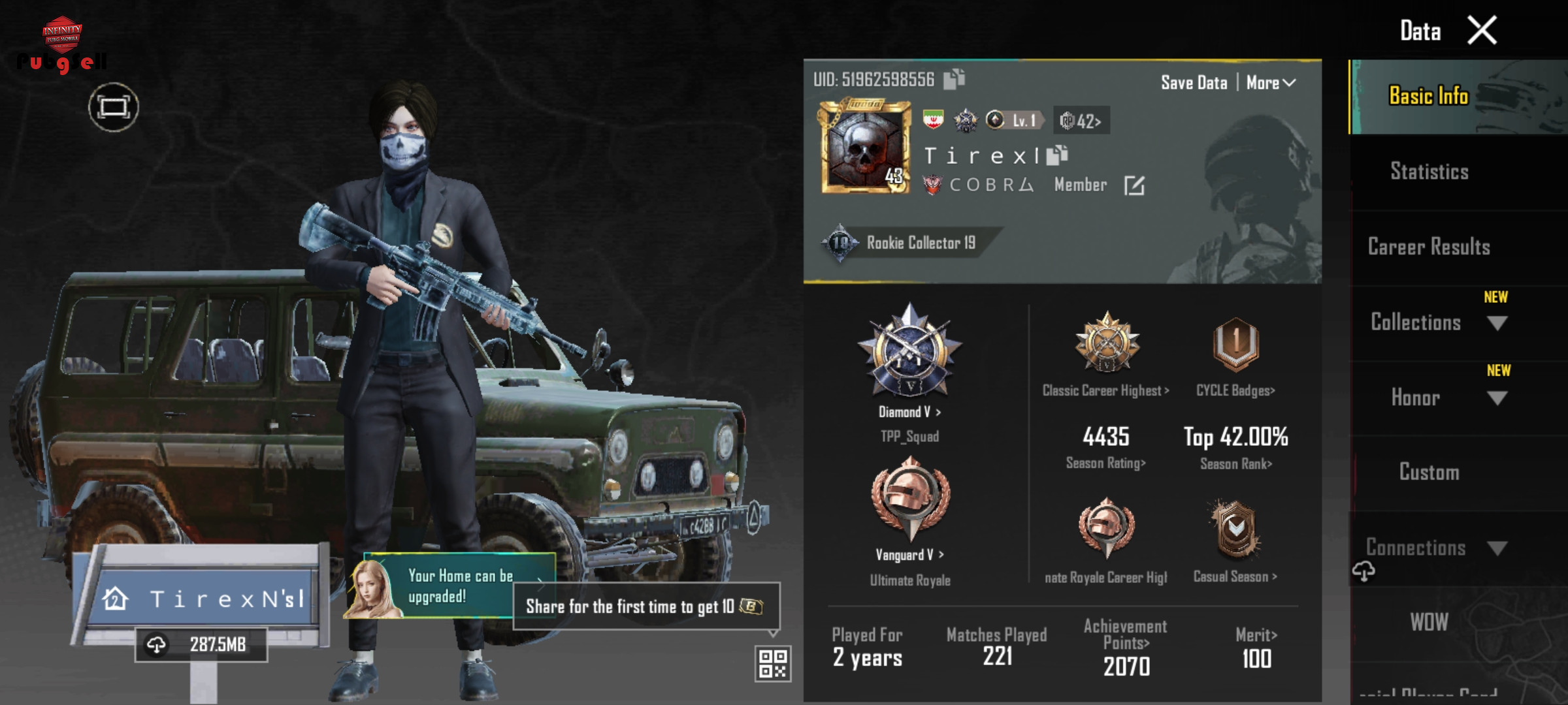اسکین M4 یخی (آپگریدی و دائمی) و دارای متریال آپگرید 72 تا کوپن پریمیر اکانت برای شروع واقعاً خوبه سنس ها و ژیرو و... تنظیمه کارت تغییر نام (change id card) هم دوتا دارم؛ یکی دائمی و یکی زمان دار زیاد.