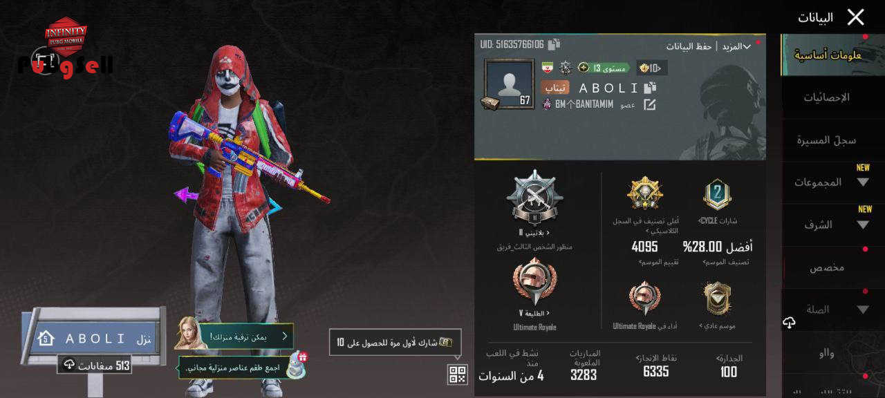 💯 لول :67 💸 تعداد یوسی :اگه به آرپی 100 برسونید 377 یوسی میشه ⭐ سیزن های الایت:تو فیلم ⚜ سیزن های الایت مکس :همه 🏆 سیزن های کانکوئر شده : 🐔 چیکن (محبوبیت) : 🔐 لینک شده :لینک سه_جیمیل ⚙️ توضیحات :اکانت خوش شانسیه دارای 8 گان های اپگریدی که 3 تا غیر آرپی 🎖 آیتم های مهم : M700 lv4📌 📌M24 فرعونlv1 تامسون آرپی کیل مسیج📌 گروزا لول 2 📌 با گان های آرپی دیگر داسیا سیزن 6 3تا جم متیک فورج متریال باکلی لباس متیک و لجند که داخل ویدیو مشاهده میکنید بک پک جوکر این فیلم یکم قدیمیه چیکن التمیت ندارد‼️