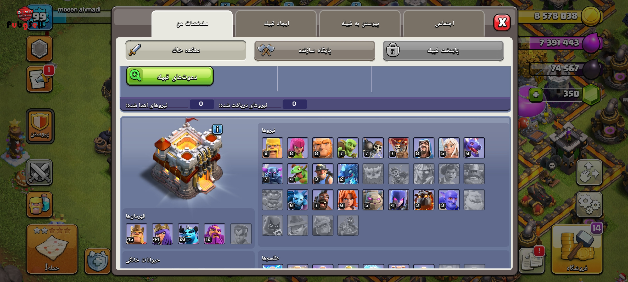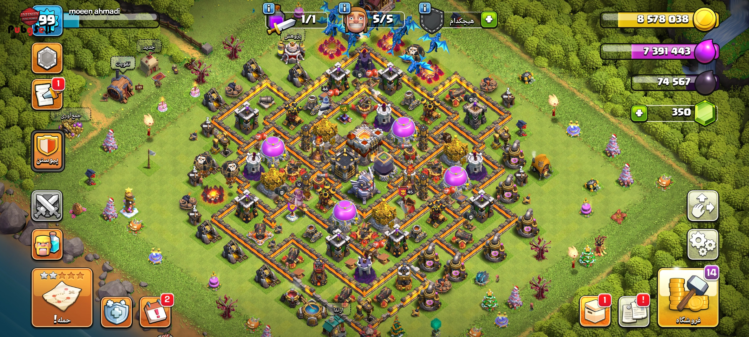 اکانت کلش آف کلنز دارای 350 عدد جم دارای تغییر نام رایگان لول 99 تاونحال 10 مکس بوده تازه انداختم به 11 تقریبا همه چی مکس دارای اسکین کینگ دزدان دریایی دارای اسکین ملکه یخی