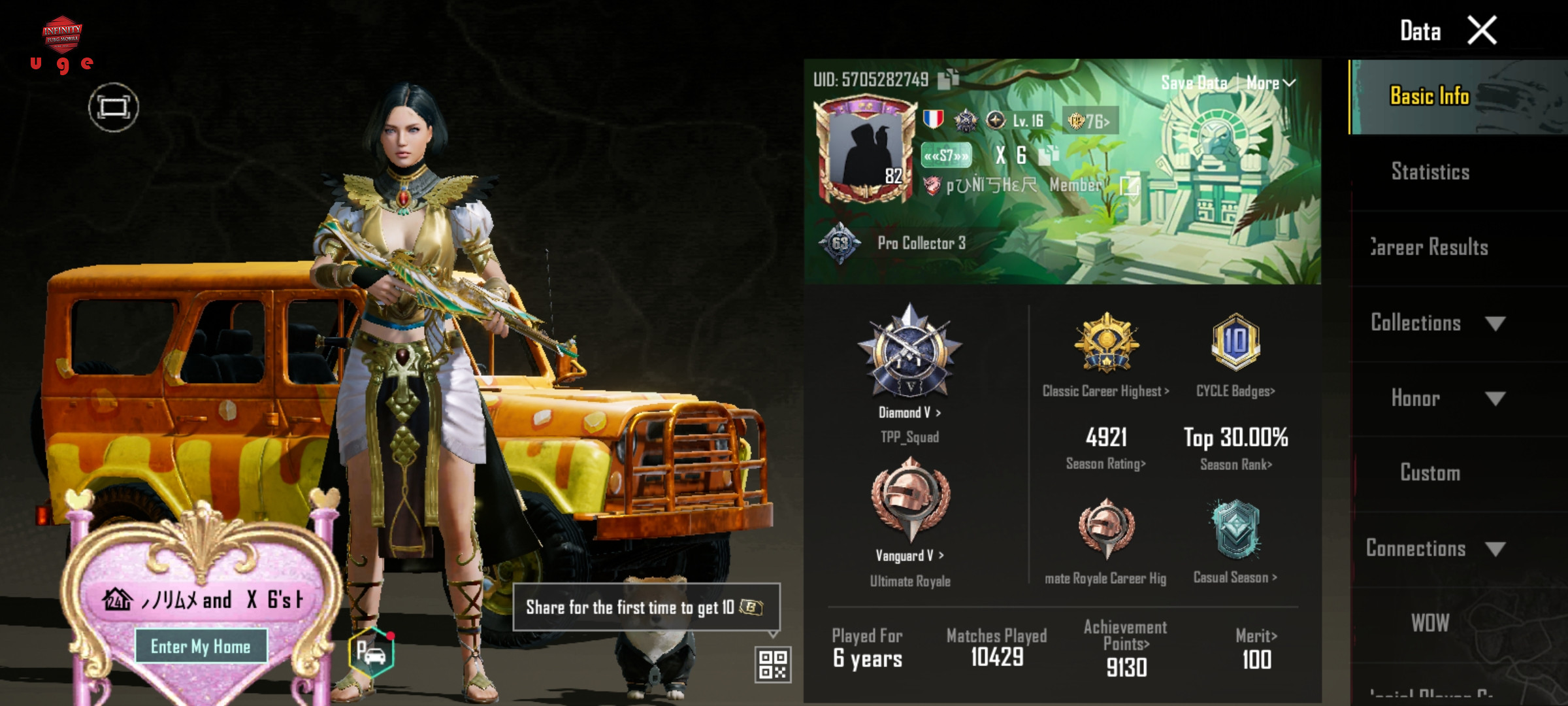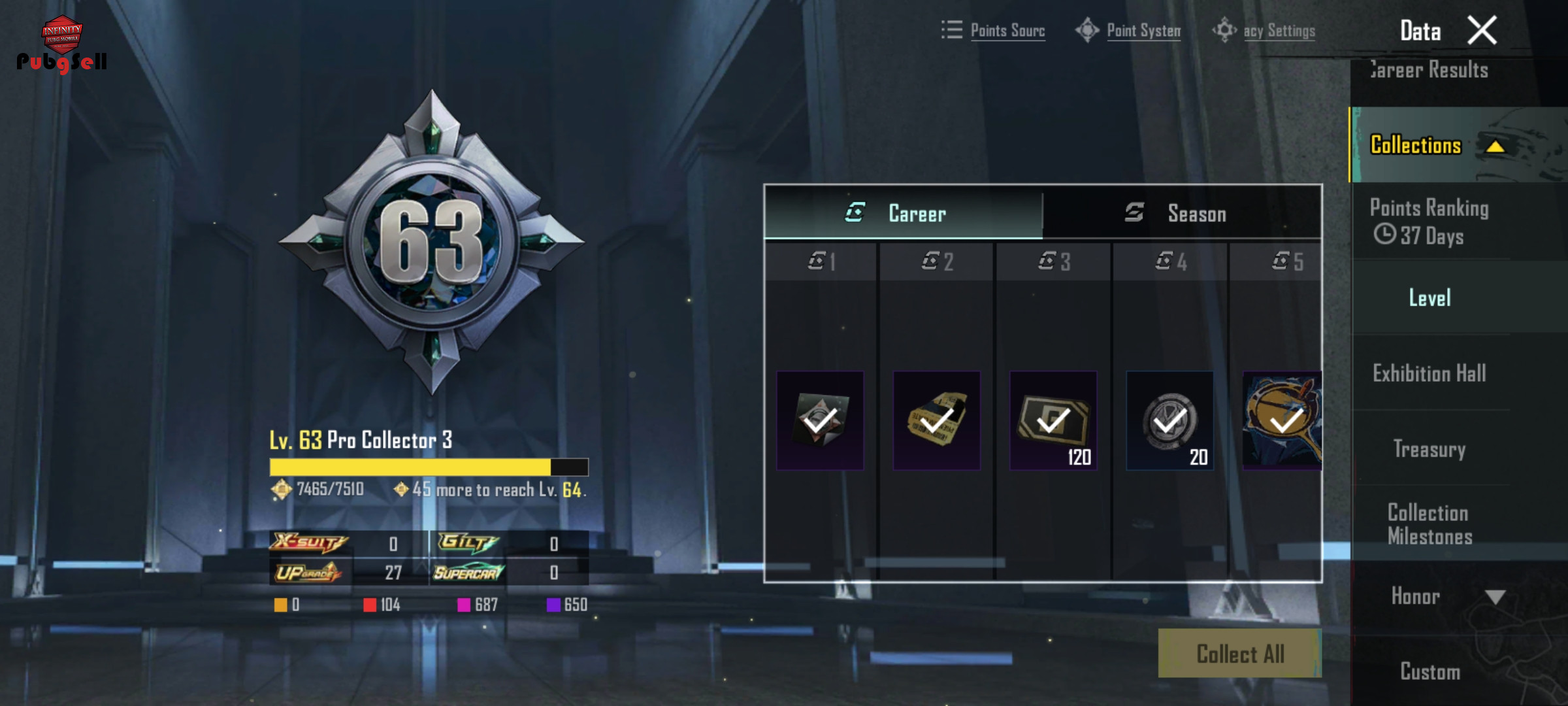 کالکشن نزدیک 64 لول 82 از m2 تا الان فقط 4 سیزن الایت نیست فیس سیزن 4 داره 26 تا گان داره 6 تا کیل مسیج امفور نداره 102 تا متیک داره ست سیزن 2 با ماسکش هلمت یخی 9000 اچیومنت و 960 کا چیکن خورده ست زن فرعون رو داره با ست جم قرمز و ست زرد که بهش چسبیده تا آخر سیزن650 یوسی هم داره که خودش 1.5 میل پولشه 5 تا کارکتر هم داره سیزن m11 و m12 رو هم الایت پلاس بوده
