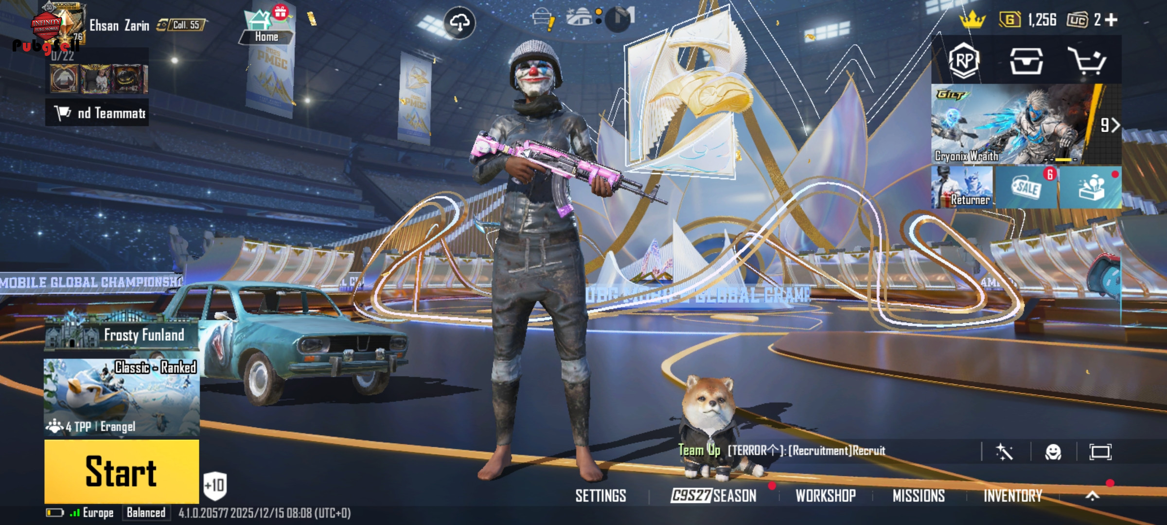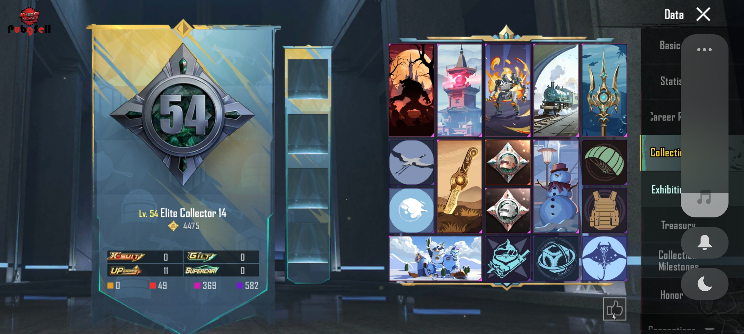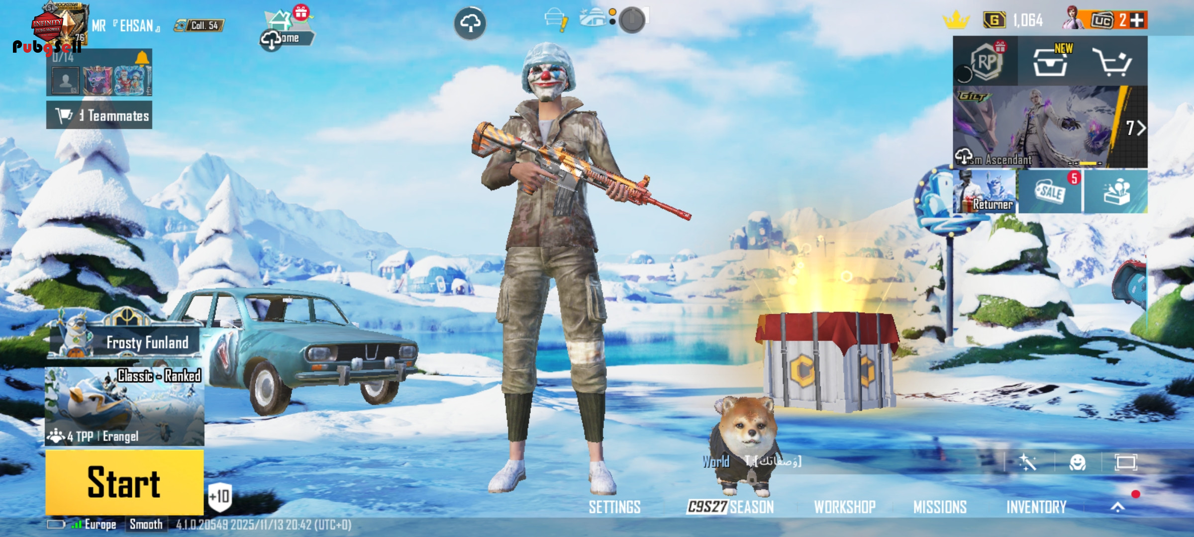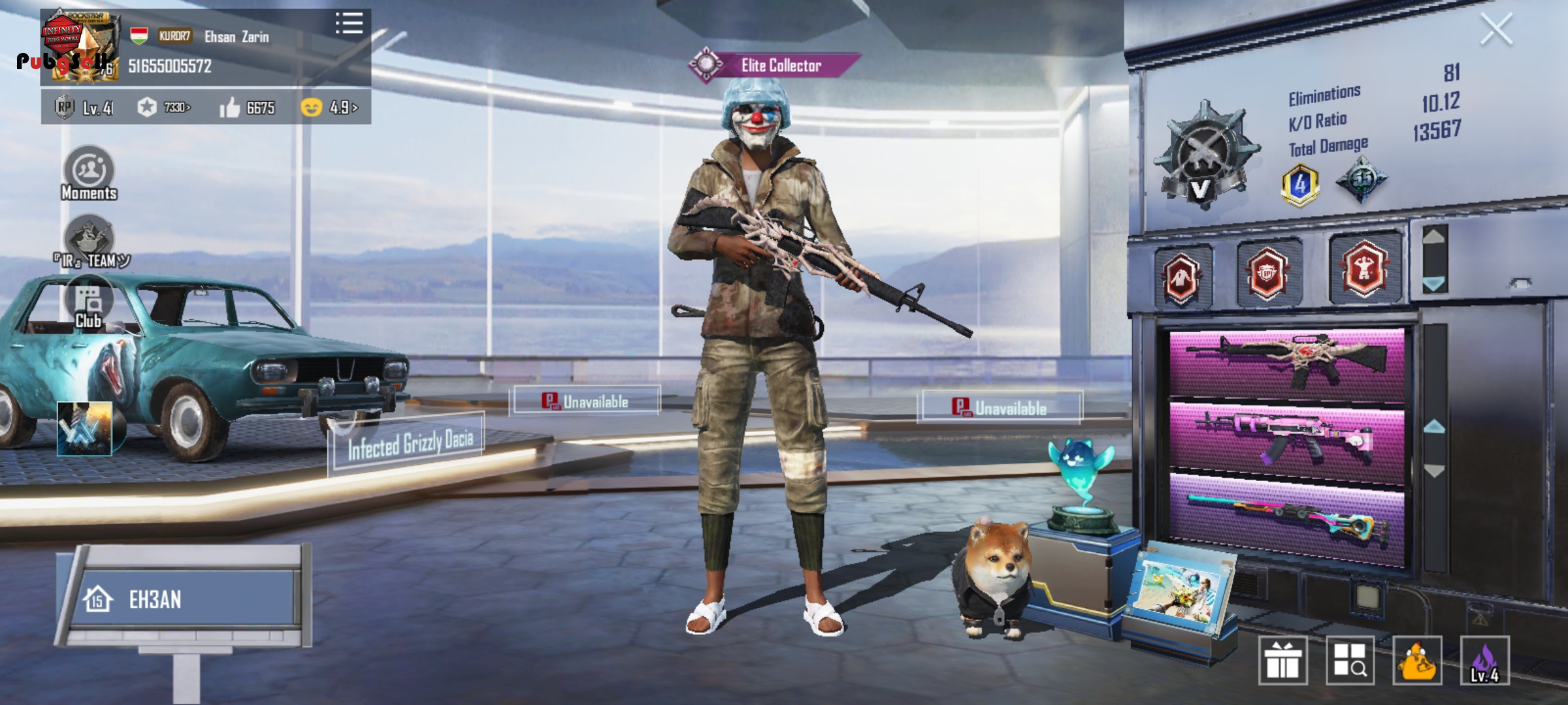19 گان اپگریدی داره: کالکشن 55 UMP-DRAGON FRE(Lv.1) GROZA-FOREST RAIDER(Lv.1) M24-KILLER TUNE(Lv.4) M762-CONCERTO(Lv.2) M16A4-SKELETAL CORE(Lv.1) VECTOR-GILDED REAPER(Lv.1) MG3-SOARING DRAGON(Lv.2) DP-28-SHENRON(Lv.4) PAN(Lv.1) MACHETE(Lv.1) PAN(Lv.1) THOMPSON(Lv.3) PP_19BIZON(Lv.1) SLR(Lv.1) UZI(Lv.3) DOGER(Lv.1) NS200(Lv.1) MK47(Lv.1) M16A4(Lv.1) در کل 184 ست لباس داره و 64 متیک داره و کیف متیک زیبا داره و هلمت یخی داره و دنس های سیزن دو و دنس های دیگر بسیار قدیمی و التیملت داره و ماسک سیزن دو و لباس سیزن دو داره و 38 ست متیک داره و دارای ماشین پیکان سیزن 6 و 9 و متیک فشن داره و دارای باگی سیزن 5 و گربه داره و 6 ست متیک غیر ارپی و ست سیزن 4 و ست سیزن 5 و ست سیزن 9 و ست سیزن 14 و دارای ست سیزن 2 و 3 است اکانت گاد گاد بسیار خوش شانس و کاراکتر اندی داره