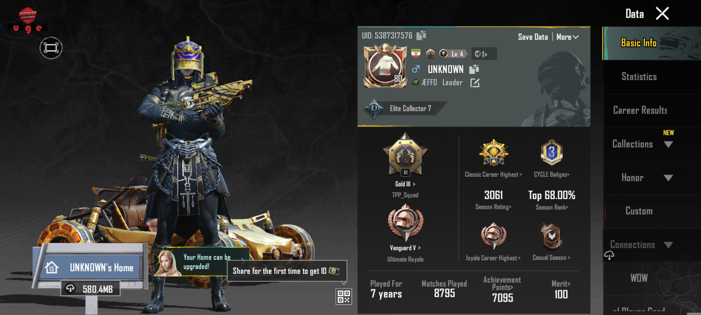 سلام . اکانت قدیمی و کامل . ایکیام آپیدت شده پی90 آپیدت شده همراه با ماشین باگی فرعون آپدیت شده . فرعون مشکی رو داره . در کل اکانت کامل هستش اسم شخص نیست . و جیمیل سوم قابل تغییر هستش از این بابت خیالتون راحت باشه .