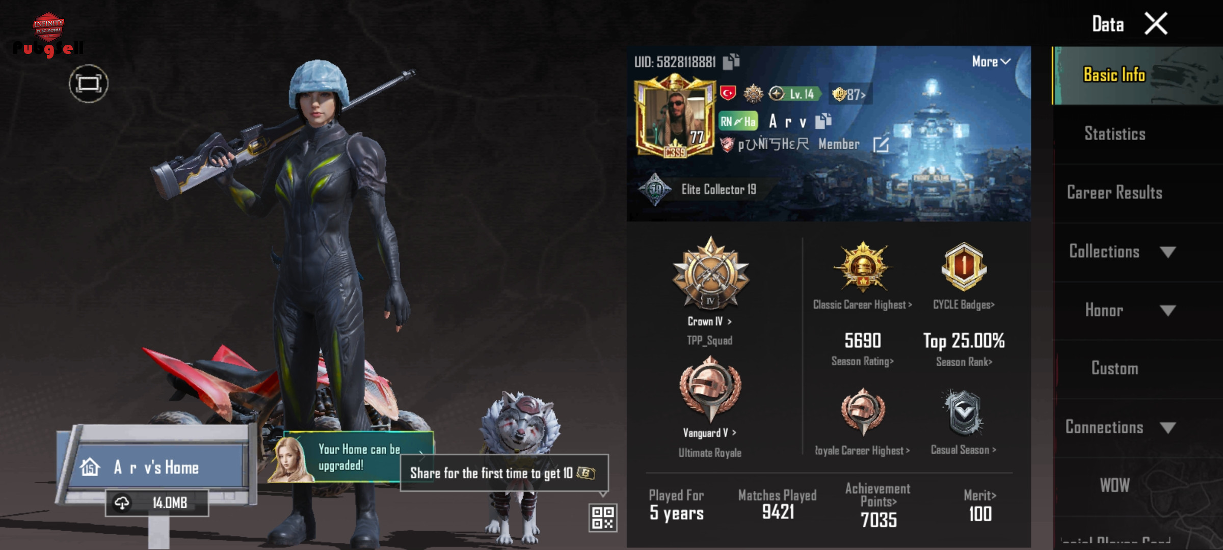 کالشکن وسط. .8860 عدد متیک 20عدد گان اپگریدی از سیزن m1 تا الان فقط 5 سیزن الایت نیست تا آخر سیزن هم 660 یوسی داره هلمت یخی داره پت گرگ رو با اسکین داره ست متیک فورج داره Scarl rp lv2 Thampson rp lv2 Dbs rp lv3 kill Groza lv1 Ump rp lv3 kill Awm lv1 M259 queen lv4 kill Uzi pharon lv3 M700 unicorn lv3 M24 seas lv4 kill کلی دنس باحال داره که بیشتر از 100 تا هست