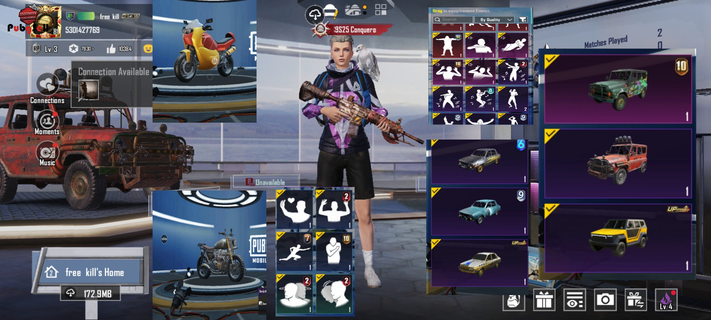 اکانت قدیمی سیزن 4 بازی الایت شده دارای 16 گان آپگریدی M4 WANDERER lvl 4 AKM DESERT FOSSIL lvl 4 UMP lvl4 M24 killer tune lvl 3 و .... یه سیزن کانکور شده (c9 cycle 25) بگ پک قدیمی گودزیلا متیک ست های تی دی امی فیس مرد و زن سیزن 4 هر دو موی سیزن 4 و 5 به همراه ریش سیزن 7 43 تا ست متیک