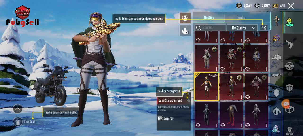 7 سیزن الایت شده،34 متیک،12 گان آپگرید داره،قبلا هم بونوس پس و هم پرایز پس گرفته شده،کیف متیک داره و همراه ست اتک آن تایتان بعضی از گان ها: پی 90 گلدن لول3 ام24 لوله یو ام پی مکس یوزی لول3 پیپی بایزن لول مکس پن لول2 شمشیر لول 2 حتما ویدئو رو ببیند همچی تو اونجاست