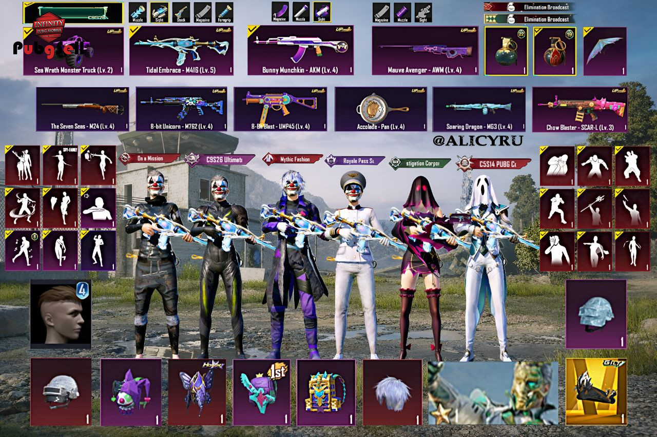 Tidal Embrace - M416 (Lv. 5) + atch Bunny Munchkin - AKM (Lv. 4) + atch Mauve Avenger - AWM (Lv. 4) 8-bit Unicorn - M762 (Lv. 4) The Seven Seas - M24 (Lv. 4) 8-Bit Blast - UMP45 (Lv. 4) Accolade - Pan (Lv. 4) Soaring Dragon - MG3 (Lv. 4) Chow Blaster - SCAR-L (Lv. 3) Candy Cane - Thompson SMG (Lv. 3) Lv.60 Collector 93 more to reach Lv.61 Silvanus X-Suit ( 1-Star) The Fool Set Invader Set Masked Psychic Rob set Dark Assassin Set Captain Full set The Fool Backpack Stellarwing Flutter E Backpack Mask + set season 2 کالکشن نزدیک 61 یک متریال و 6 مینی مت دو تا جم متیک فورج 70 تا لاکی کوین دنس های خفن یکیش الایت پلاس سیزن چهاره هلمت یخی و متیک سه جایگاه گان باز ماشین آپگریدی لول دو اکانت تمیز زیاد روش خرج شده مخصوص پلی فروش فوری بقیه ایتم داخل ویدیو ❤️
