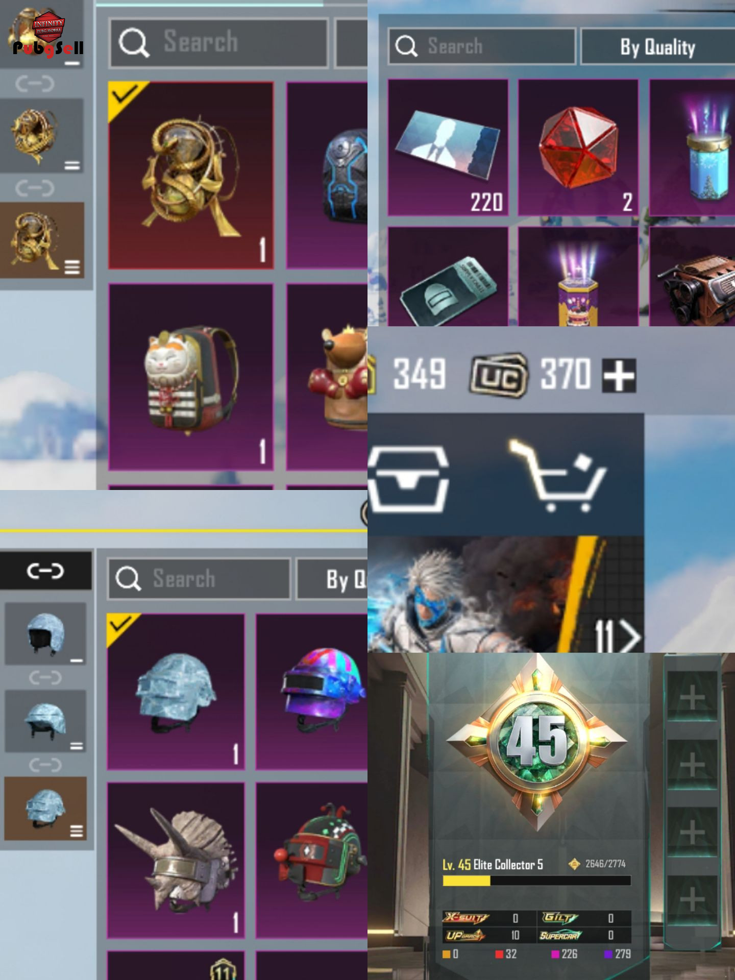 گان های آپگریدی آرپی : vss لول 1، mp7 لول 1، اسکارل مکس، mk47 لول 1، m16 مکس گان آپگریدی غیر آرپی : ، sks, m16 skeletal core (همه لول 1) m762 یونیکورن لول 4، Thompson متیکفورج لول 4 awm ایکسوت لول 2 لول کالکشن45، 2 جم متیک فورج، بکپک متیک و هلمت یخی، دنس های متیک و قدیمی، موی سیزن 5 ، نید و مولوتوف آپگریدی متیک های غیر آرپی: 3 ست پرایزپث انیمه ای، ست bonus path، ست متیک ایکسوت