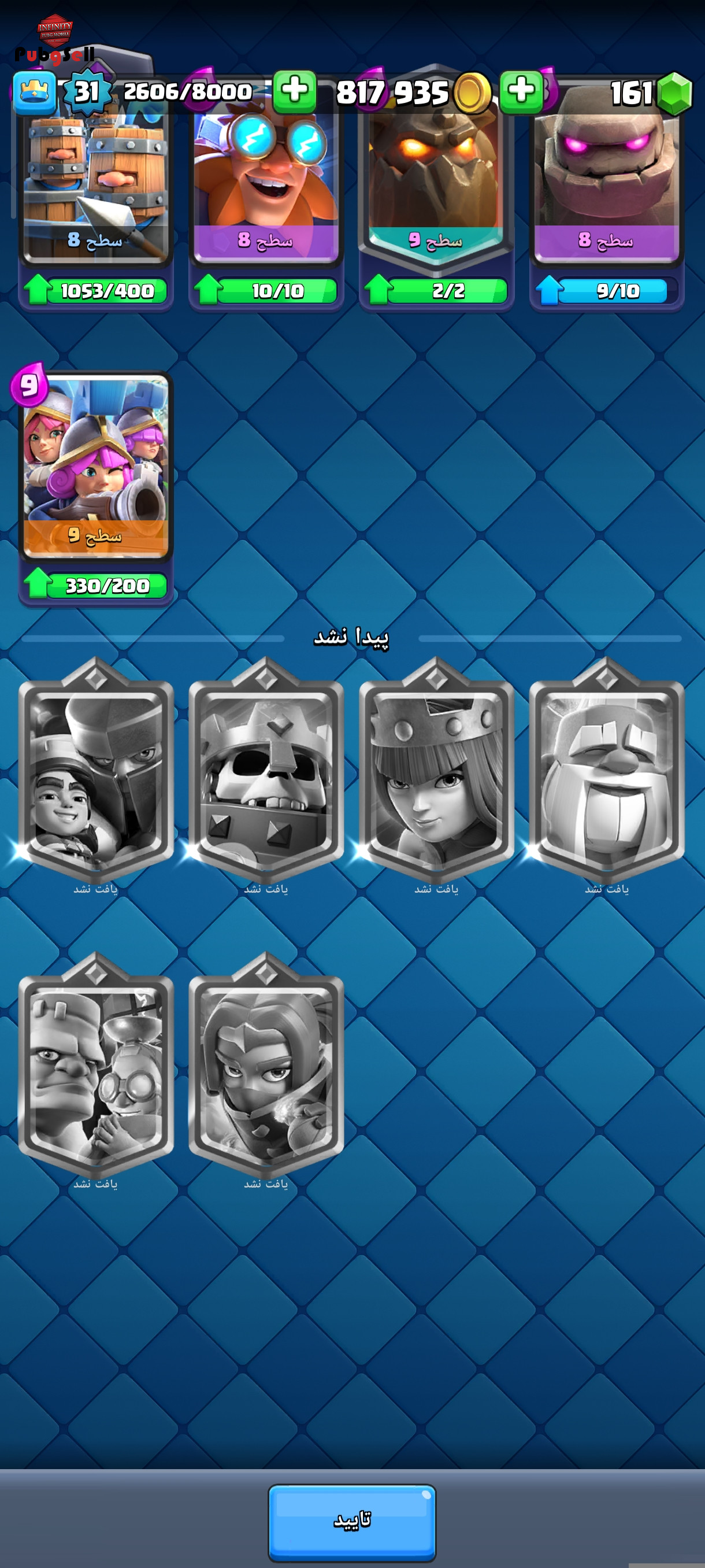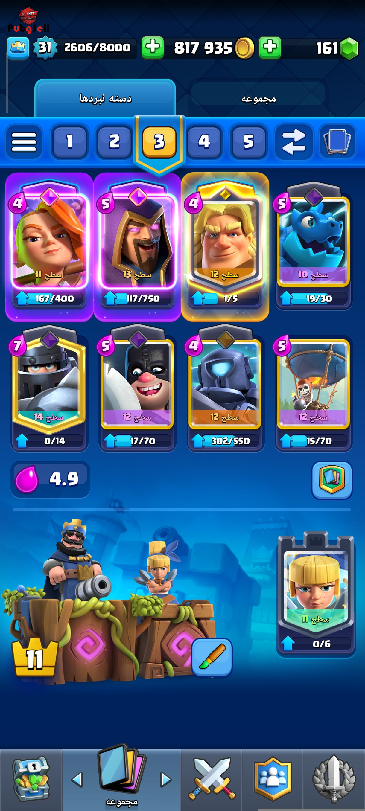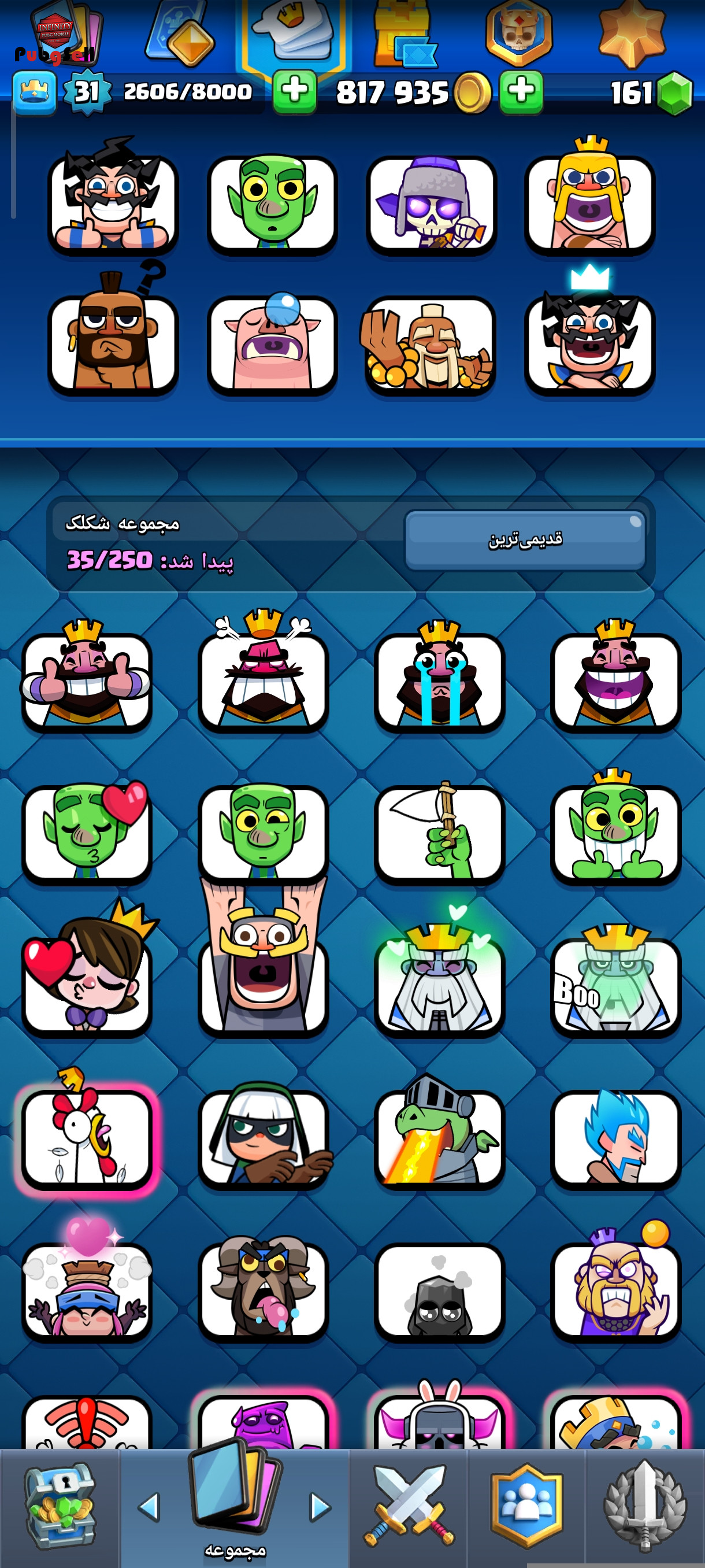 سلام این اکانت کل کارت های کارکتر هارو گرفته غیر از 6تاش اکانت لول 31 لول برج 11 تعداد ایموجی 35 تعداد جم91