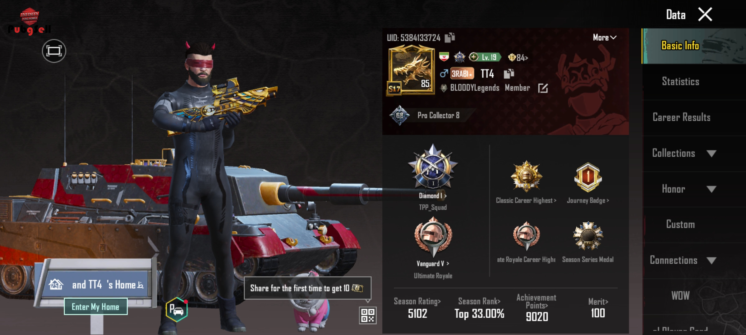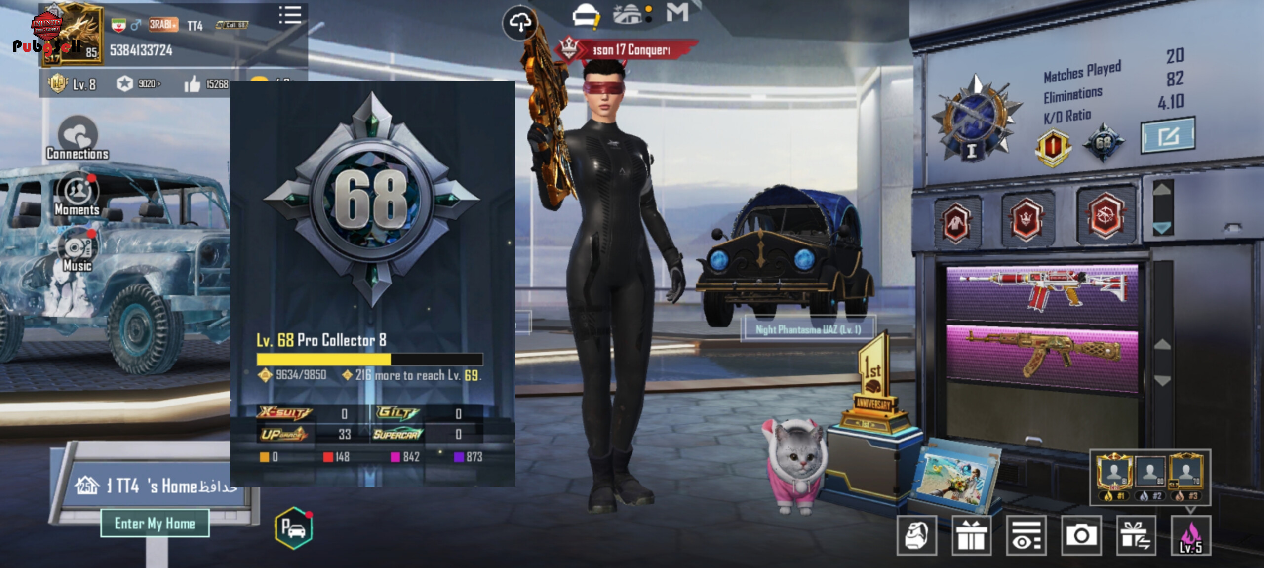 این اکانت از سیزن s5 ساخته شده / از سیزن s7 تا الان الایت داره که چند تا میس داده/ 2عدد لابی متیک /کالکشن وسط 68 هستش/ 148 عدد ایتم متیک داره/ 33 عدد گان اپگریدی/ 10 تاش کیل مسیجه/ فیس سیزن 4/ مو سیزن 4/ ریش سیزن 7/ 1 عدد هلمت متیک/ هلمت یخی/ 3 عدد بک پک متیک/ ست متیک غیر ارپی زیاد داره/ فول کارکتر به جز 2 تا اندی و کارلو رو داره با چند تا دیگه/ تحویل فوری فوری !! 660 یوسی هم رو اکانته. فیلم اکانت هم میزارم که مشخصات کامل رو ببینید